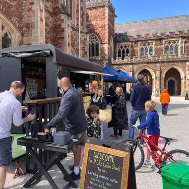 We serve outstanding coffee, other hot and cold drinks and delightful sweet goods at events such as markets, sports events, festivals, weddings, business events and parties. If you would like to have our coffee trailer at your event in the West Country, please get in touch.